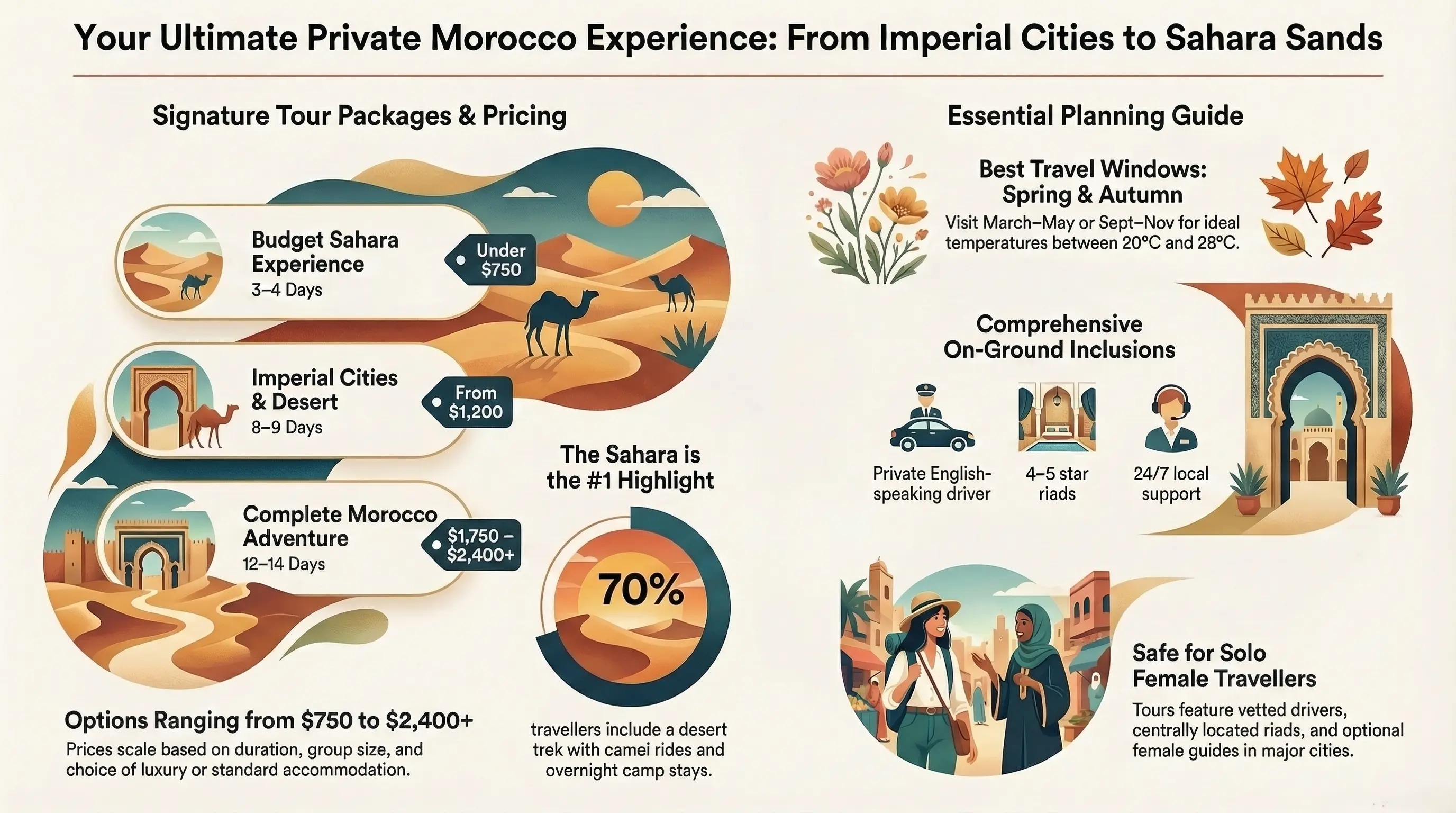 Marrakech & Sahara Express | 5 days | $890 | Private driver, camel trek, 1-night desert camp, 4-star riads |