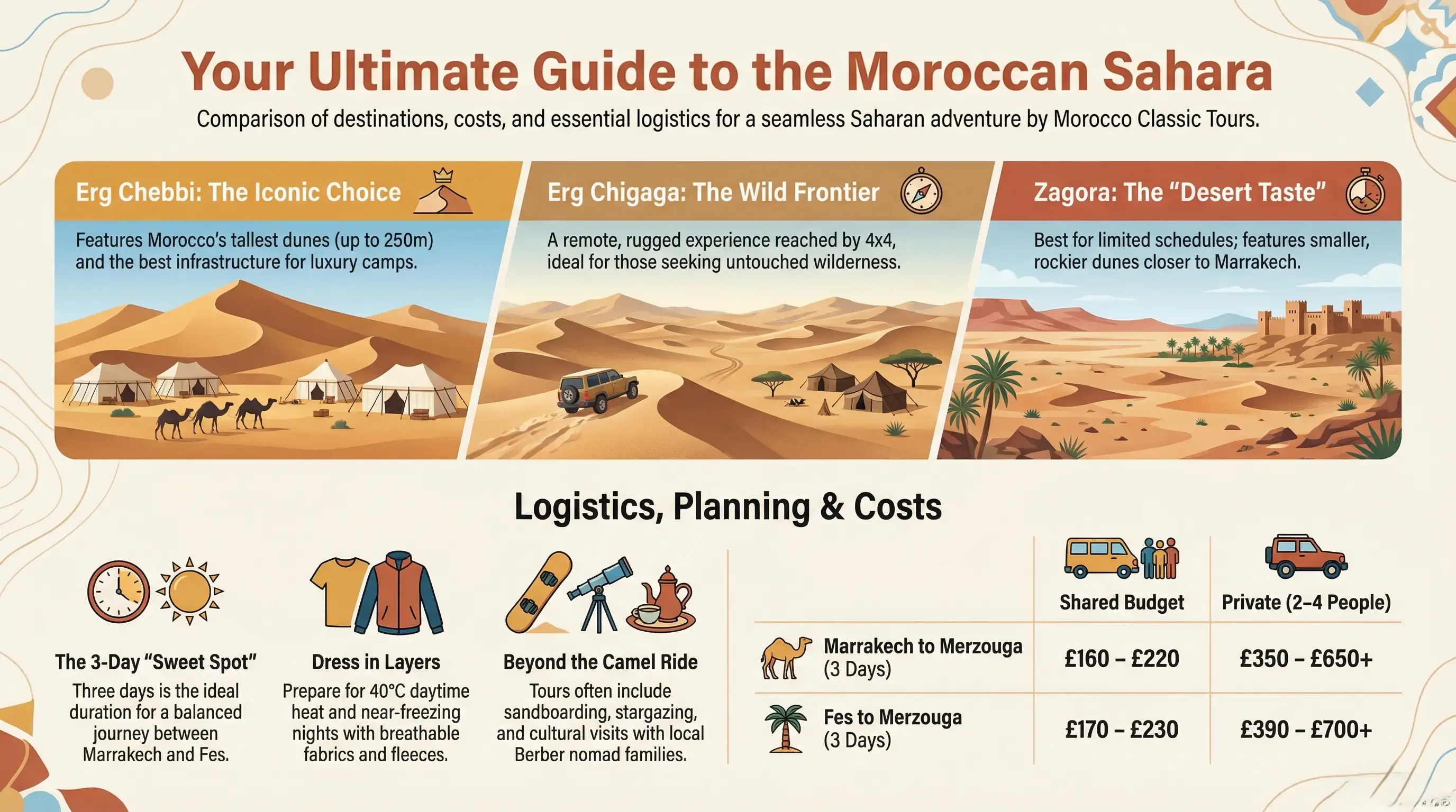 An average 10-day guided tour in 2026–2027 with Morocco Classic Tours typically ranges from about $1,300–$2,400 USD per person, depending on season, comfort level, and whether it includes Sahara camping and domestic flights.