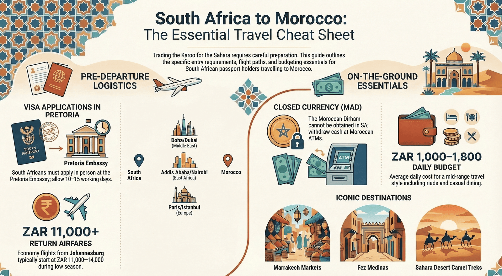 Typical return economy airfares from Johannesburg to Casablanca or Marrakech start around ZAR 11,000–14,000 in low season, often higher during peak periods. On-the-ground costs in Morocco can be similar to or slightly cheaper than those in South Africa when using local eateries and riads.